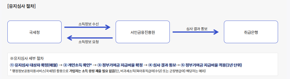 유지심사는 가입 후 1년마다 개인소득을 재확인하여 정부기여금 지급비율을 재산정하는 절차입니다.