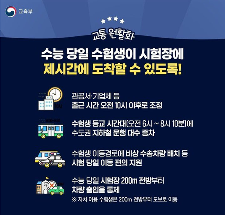 정부는 수험생이 제시간에 시험장에 도착할 수 있도록 출근시간 조정, 지하철 증편, 비상 수송차량 배치 등 전방위 교통 지원에 나섭니다.